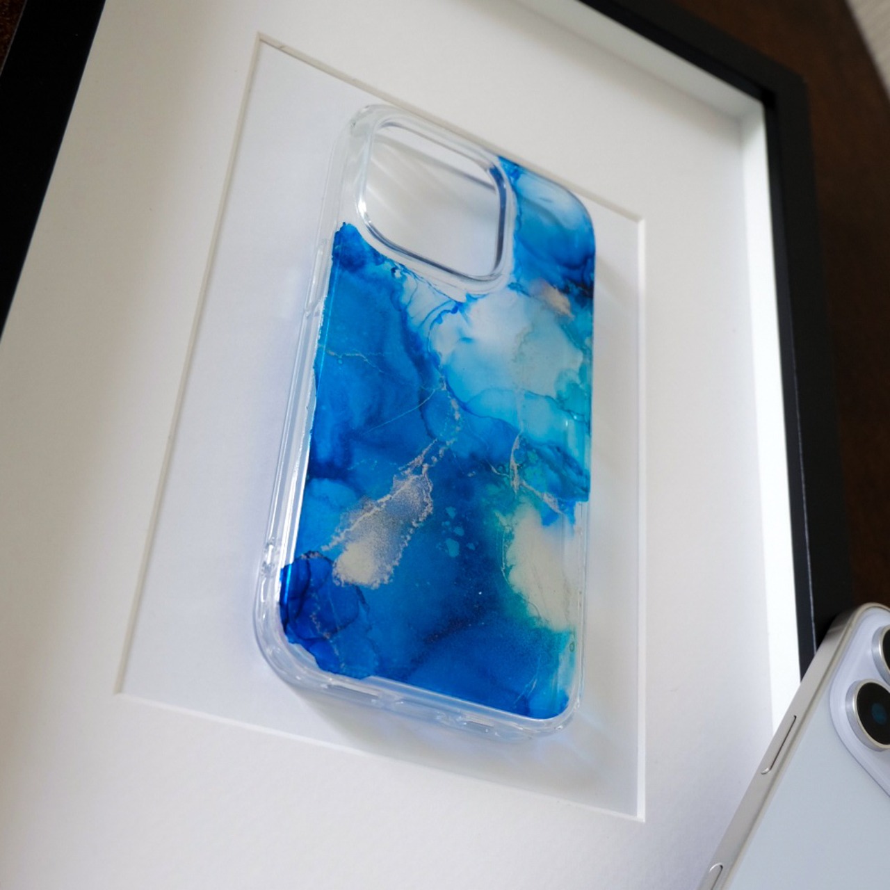 透明なケースに、アルコールインクアートをほどこした、あなただけのスマホケースです
