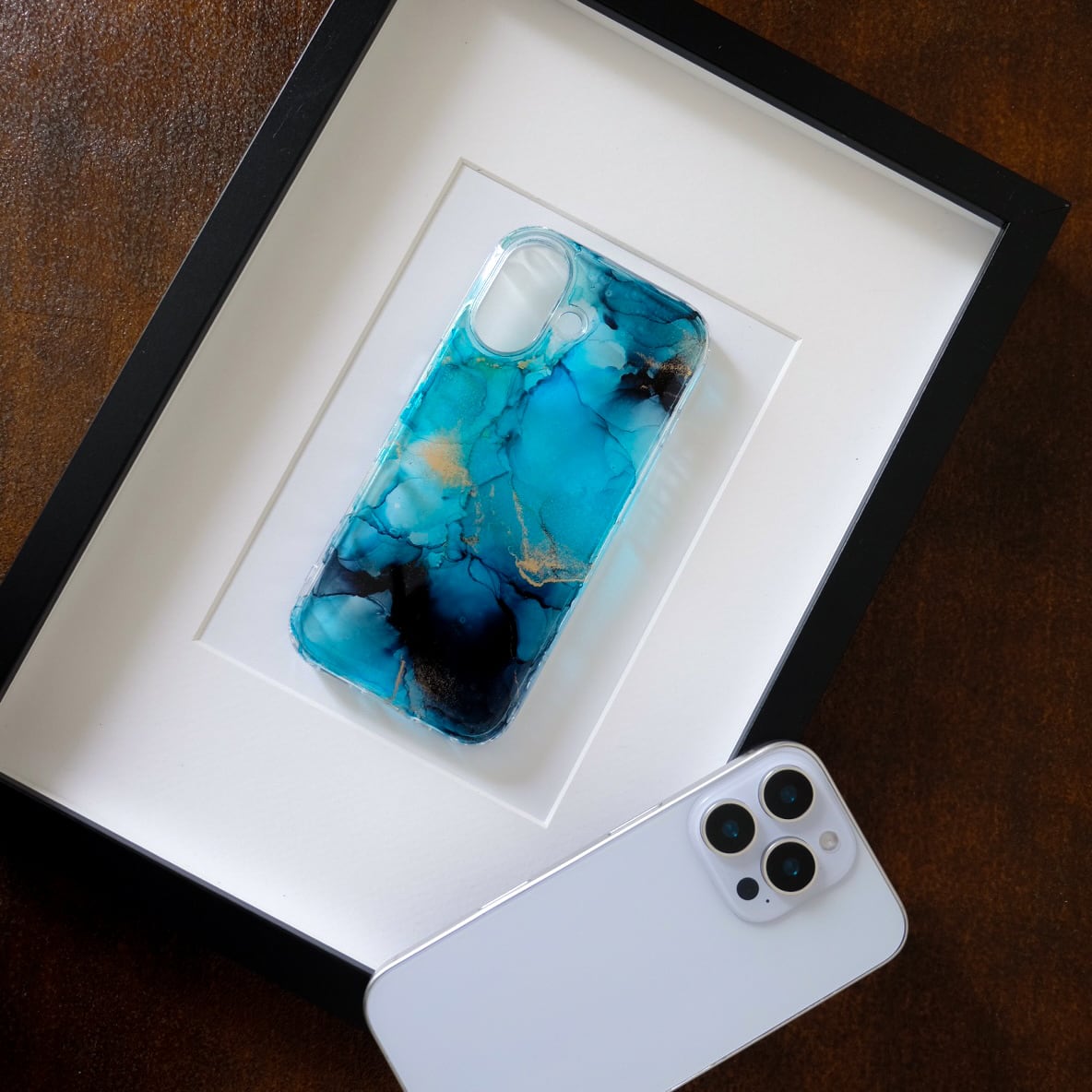 透明なケースに、アルコールインクアートをほどこした、あなただけのスマホケースです